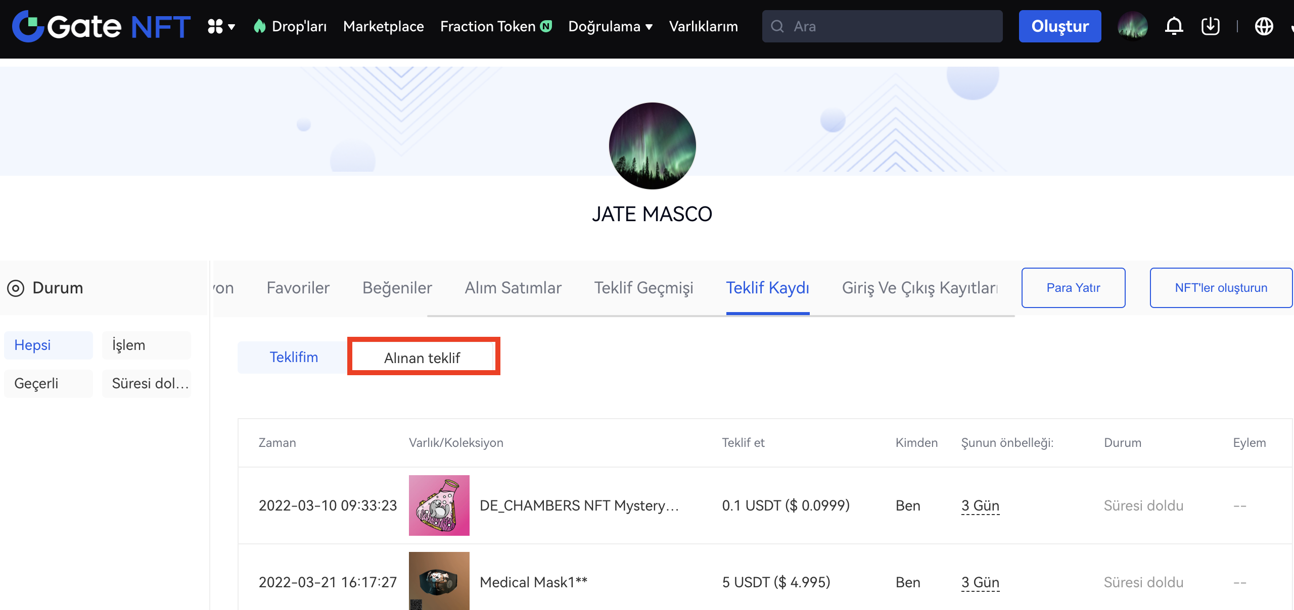 Adım 2:Sahip olduğunuz NFT varlıkları için alınan teklifleri görmek için Varlıklarım sayfasında “Teklif Kaydı”na tıklayın. Geçerli kalan herhangi bir teklifi kabul etmeyi seçebilirsiniz ve anlaşma hemen yapılacaktır.