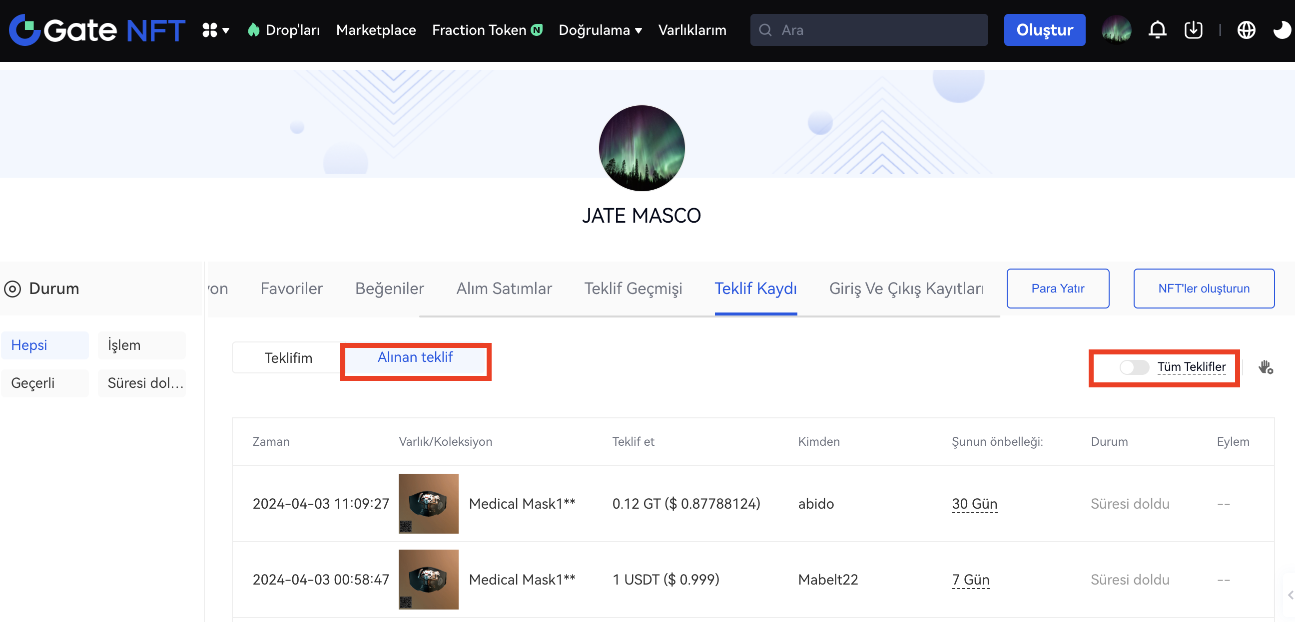 Adım 1:”Alınan Teklif” arayüzünde, bloke olanlar dahil, aldığınız tüm teklifleri görüntülemek için sol taraftaki “Tüm Teklifler” butonuna tıklayın. Sağ taraftaki “Minimum teklif ayarı” butonuna tıklayarak minimum teklif limitini belirleyebilirsiniz.