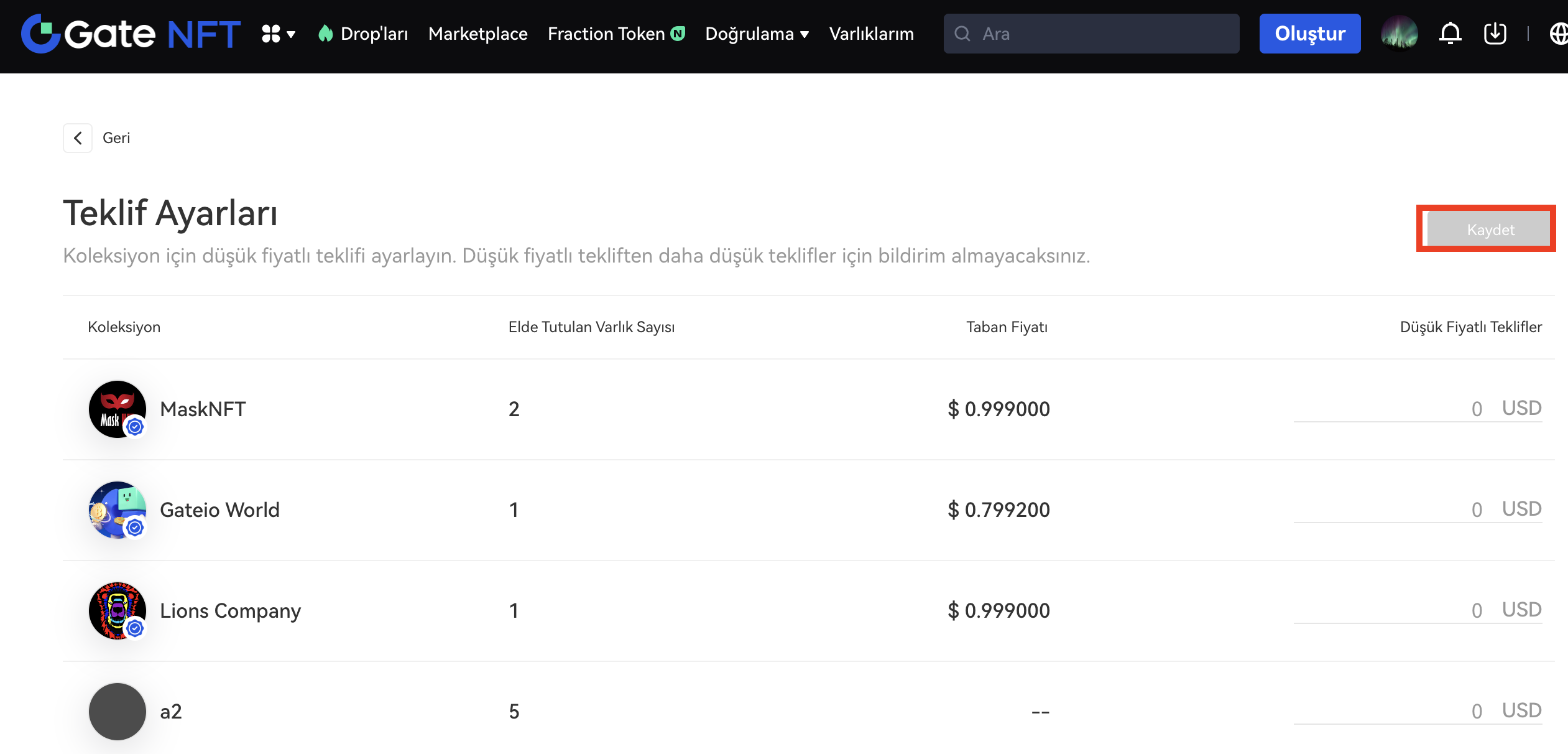Adım 2:Minimum teklif ayar sayfasında, minimum teklif limitini belirlemek istediğiniz NFT portföyünü seçin, sağdaki giriş kutusuna minimum teklif tutarını girin ve “Kaydet” butonuna tıklayın. Ayardan sonra, koleksiyondaki tüm varlıklar için sınırın altındaki teklifleri almayacaksınız.