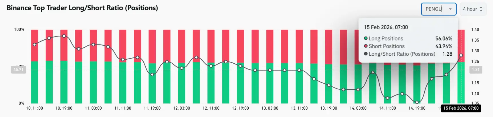 Data on top traders’ positions on Binance shows 56.06% Long versus 43.94% Short, with a Long/Short ratio of 1.28.