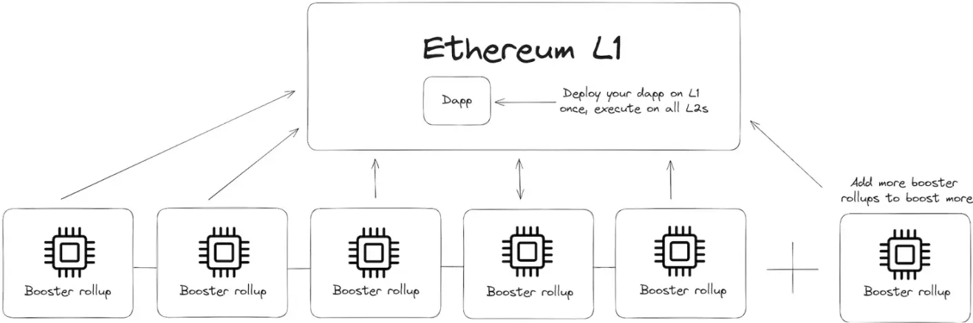 想象一下,你的 DApp 只需部署一次,就可以自动将其扩展到所有 L2,如果需要额外的区块空间,还可以添加更多「booster rollups」,且无需任何额外的设置工作。