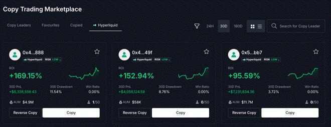 Users who navigate to BitMEX’s Copy Trading Marketplace will see a Hyperliquid sub-tab. This displays a leaderboard of the top Hyperliquid traders that they can copy or reverse copy trade. Positions are automatically opened on BitMEX, replicating the strategy of the Hyperliquid trader in question. Each Hyperliquid trader is ranked by metrics such as PnL, Drawdown, Win Ratio, and AUM (Assets Under Management), making it easy to identify top performing traders.