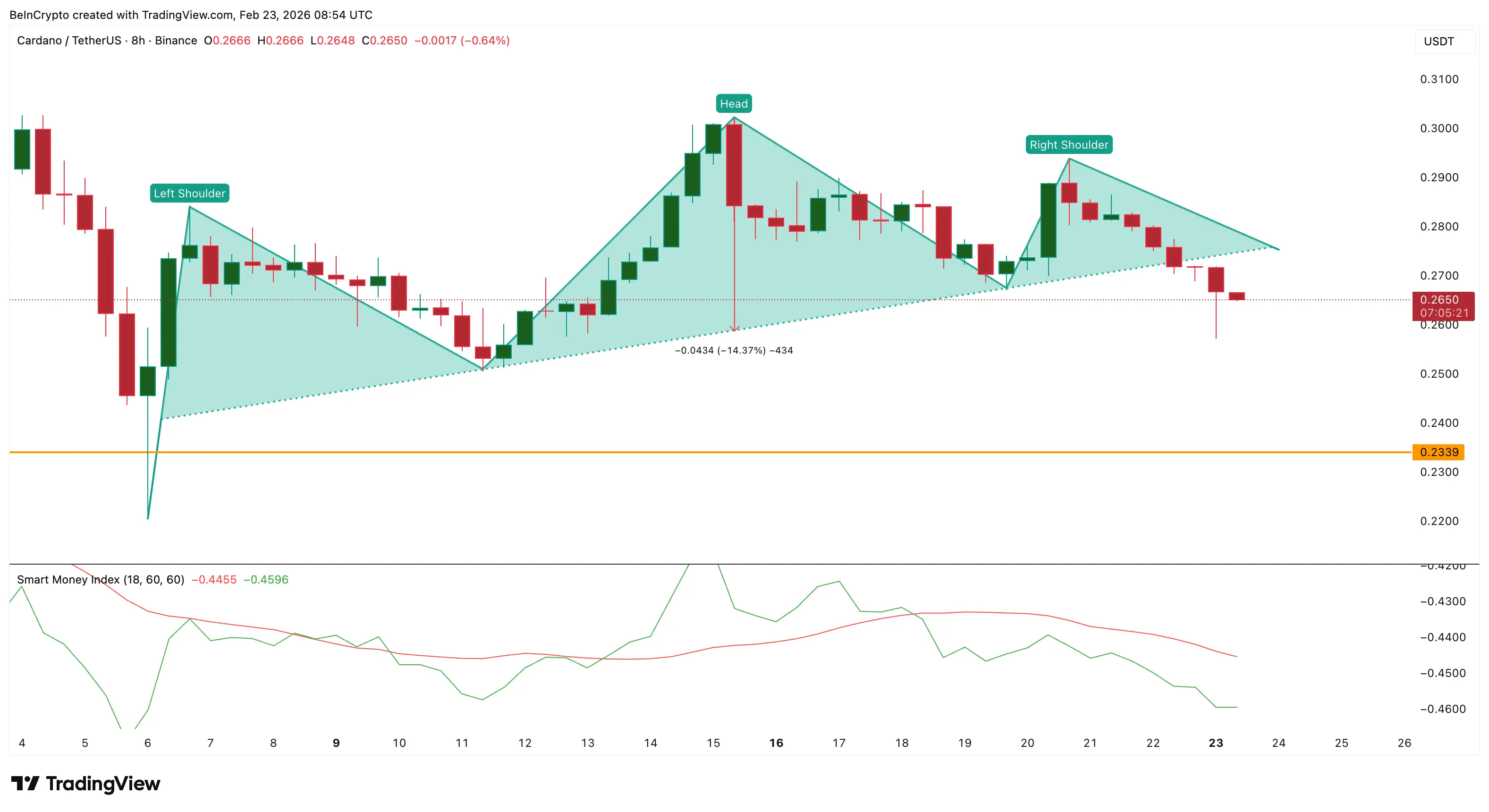 On the 8-hour chart, ADA has confirmed a breakdown of the head and shoulders pattern, a classic trend reversal signal. The price has fallen below the key support at $0.266 and is now hovering around $0.2572.