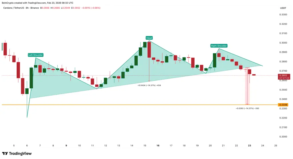 Meanwhile, retail investors actively “bought the dip.” ADA exchange outflows surged from $344,450 on February 21 to $2.55 million on February 23, a 640% increase. This divergence between whales and retail investors is often a warning sign that the market has not yet bottomed.