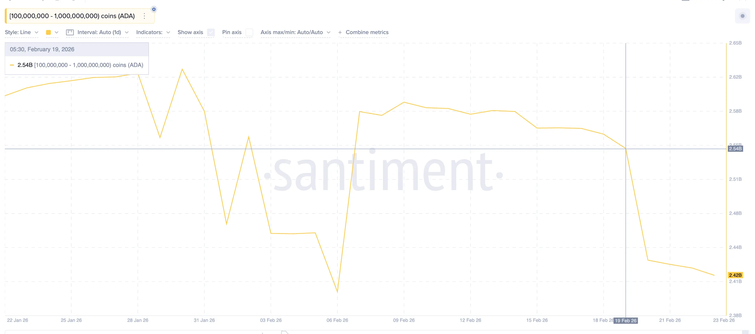 On-chain data indicates that Cardano whales acted ahead of the decline. The largest whale group holding between 100 million and 1 billion ADA reduced their holdings from 2.54 billion ADA to 2.42 billion ADA between February 19 and 23, trimming approximately 120 million ADA worth nearly $30 million.
