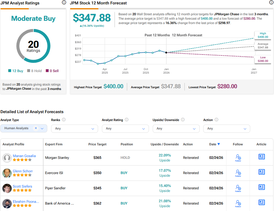 Turning to Wall Street, analysts have a Moderate Buy consensus rating on JPM stock based on 12 Buys, eight Holds, and zero Sells assigned in the past three months, as indicated by the graphic below. Furthermore, the average JPM price target of $347.88 per share implies 16.4% upside potential.