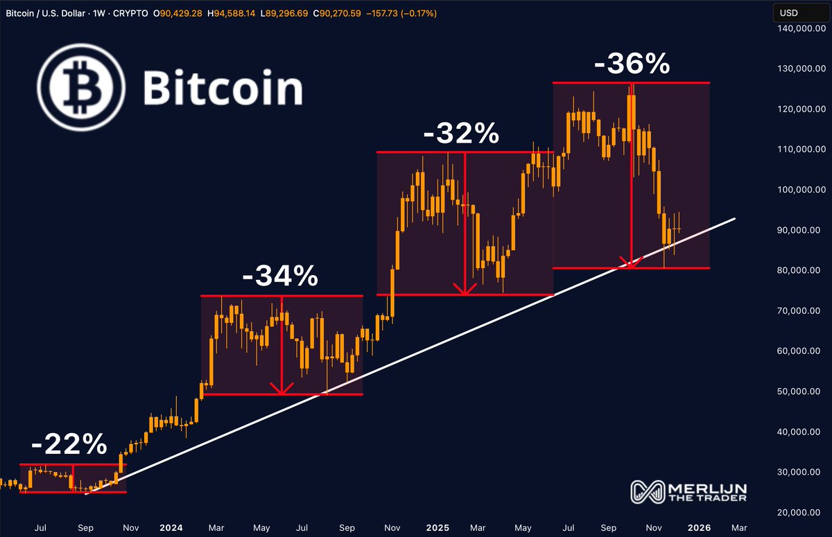 A second chart from Merlijn zooms out to the weekly timeframe, showing how Bitcoin’s current drawdown fits a recurring pattern. Every major leg of this cycle included brutal corrections before making fresh highs: a 22% dip, a 34% reset, and a 32% continuation correction all preceded impulsive rallies. The latest 36% decline continues that rhythm rather than breaking it.