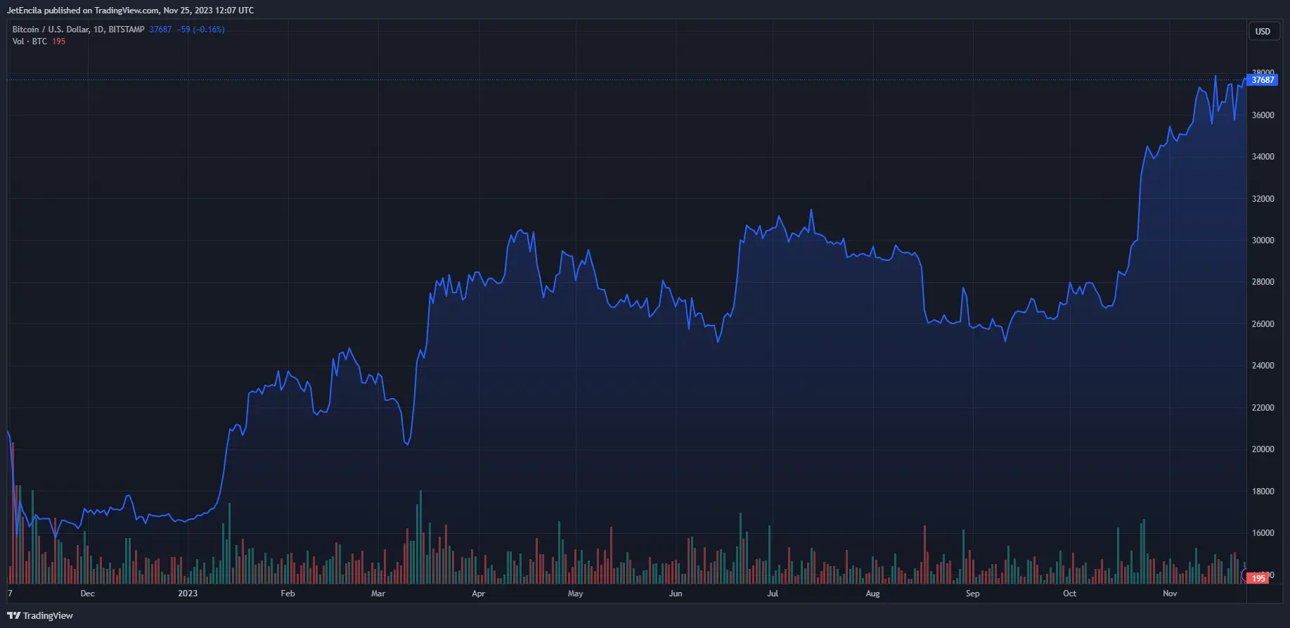 Bitcoin (BTC) is currently trading at $37.687. Chart: TradingView.com