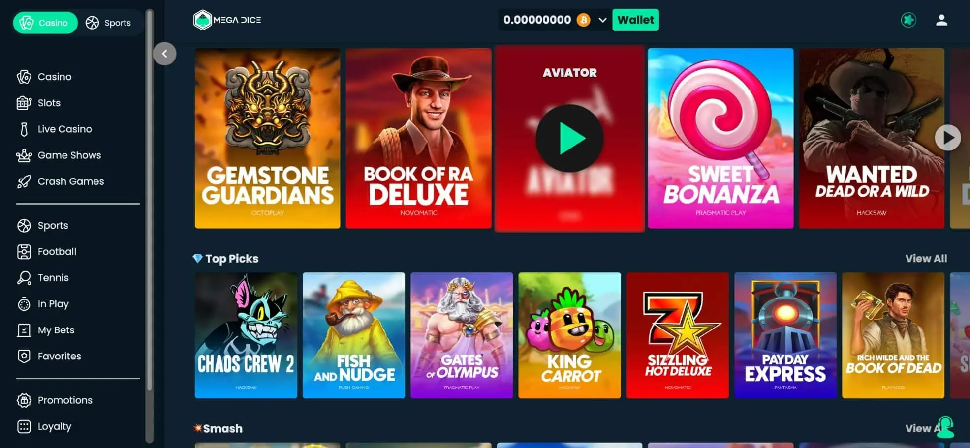 Mega Dice also offers crypto games, such as dice, crash, plinko, and keno. We like the Mega Dice welcome package, which matches the first deposit by 200%. The maximum deposit is 1 BTC or the altcoin equivalent. New players also receive 50 free spins. The Mega Dice loyalty program is also worth checking out.