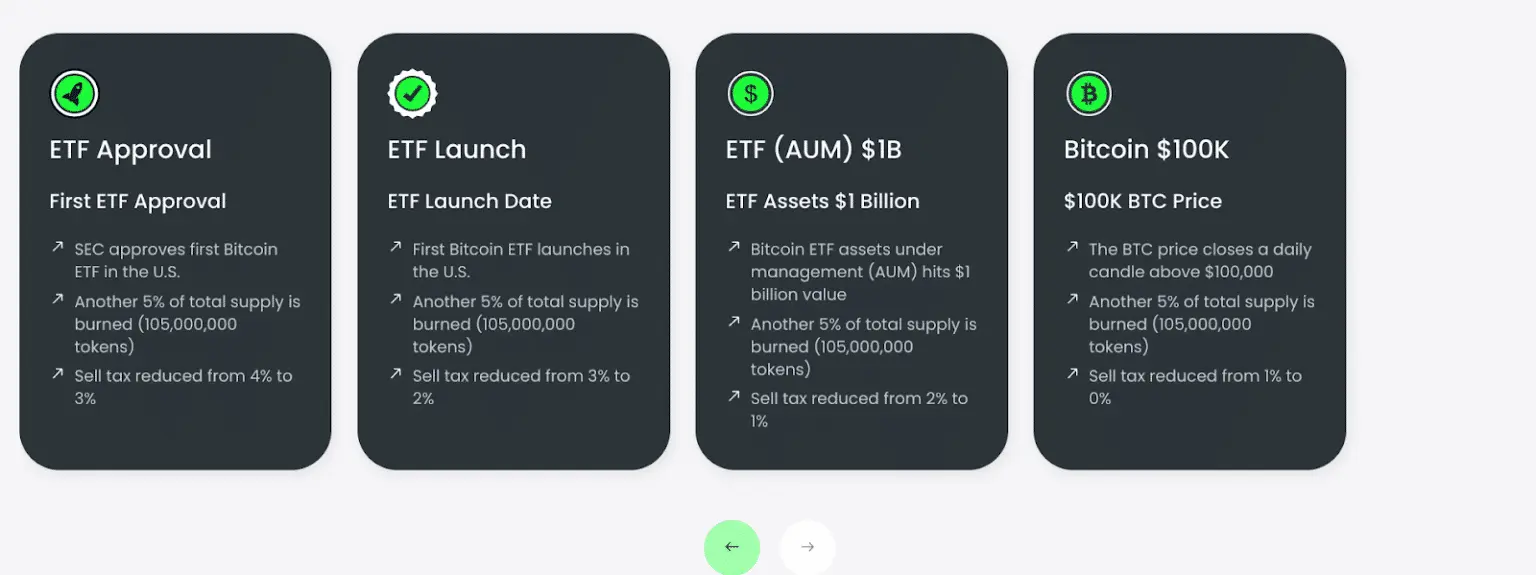 Set for stage 3 of the Bitcoin ETF project roadmap, an initial burn mechanism will be introduced amid a well-marketed DEX launch, imposing an initial 5% burn tax on transactions – this will be reduced by -1% each time a Bitcoin ETF news milestone is reached.