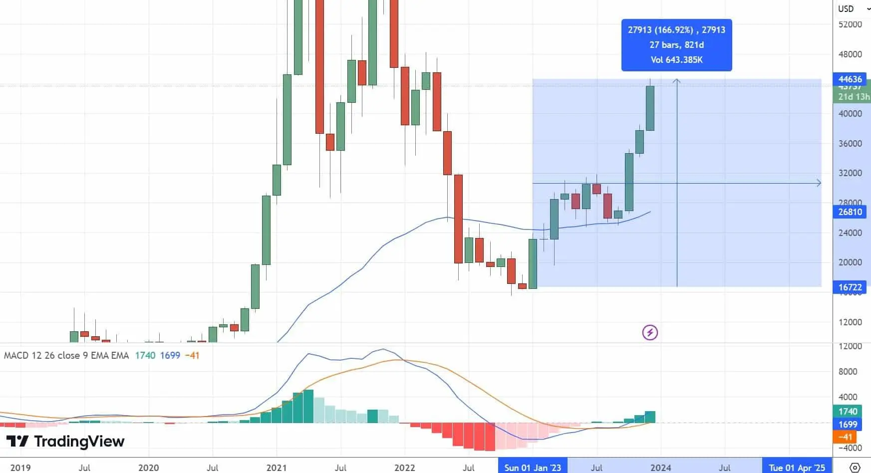 Conversely, Bitcoin finds immediate support at $42,026, with additional supports at $41,000 and $40,026, offering potential fallback points during pullbacks.