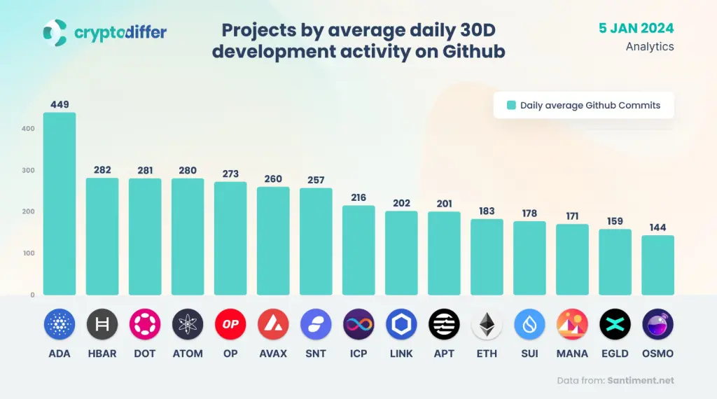 Cardano’s substantial lead in this aspect not only signifies the current momentum in its development efforts but also reflects a dedicated community and a forward-looking approach to blockchain technology.
