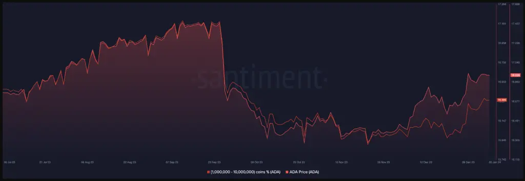 Meanwhile, analyzing data from Santiment, NewsBTC conducted an assessment of the ADA holder addresses and observed a noteworthy increase in the holdings of the 1 million to 10 million ADA cohort.