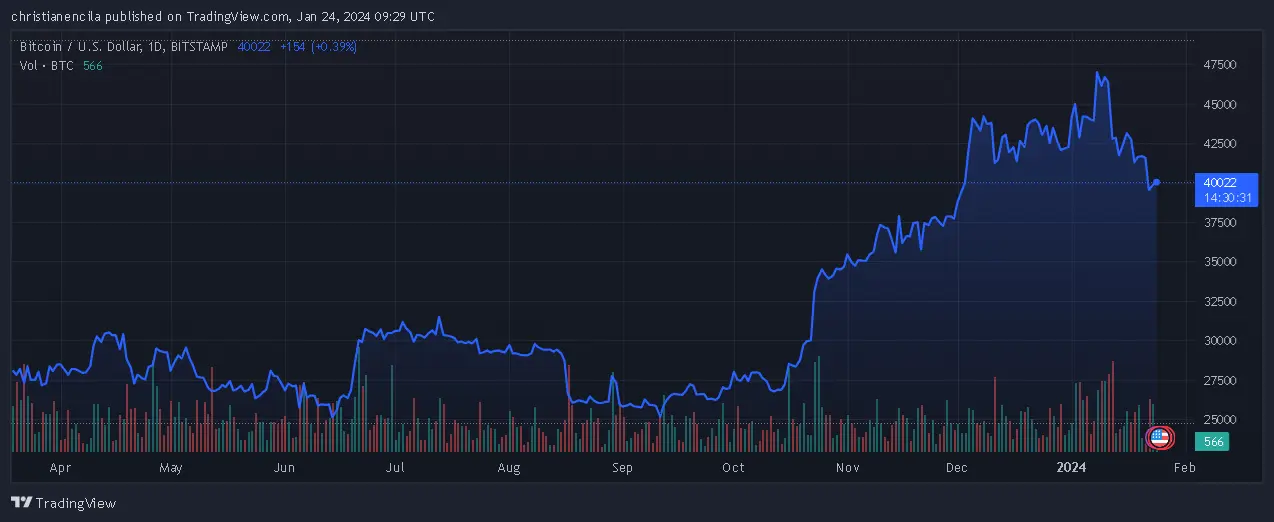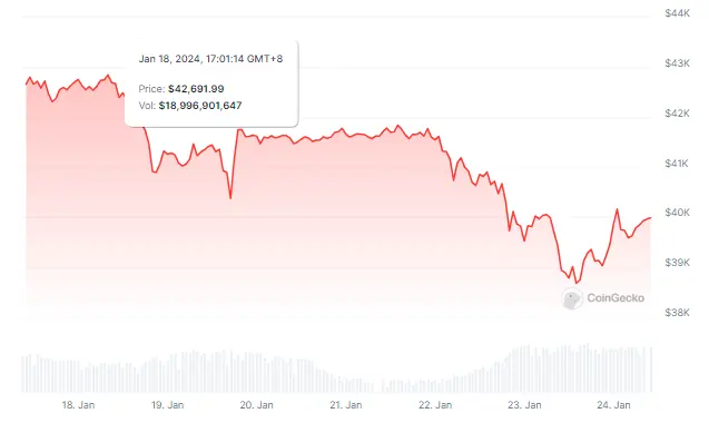 The price surge in anticipation of the ETF approval saw Bitcoin reach nearly $49,000 on January 11th. However, since the green light for the ETFs, the cryptocurrency has retreated steadily, trading at around $39,500 at the time of writing.