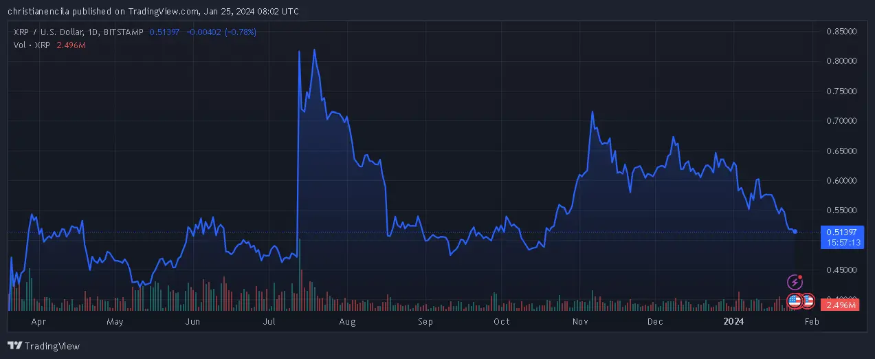 At the time of writing, XRP was trading at $0.51, down 0.4% and 9.3% in the last 24 hours and seven days, respectively, according to data from Coingecko.