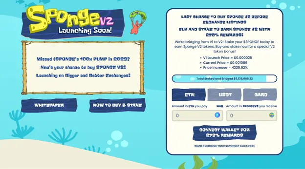 Those staking $SPONGE V1 will receive an equivalent amount of V2 when it launches. They can also earn a 278% APY if they keep $SPONGE staked after the launch.