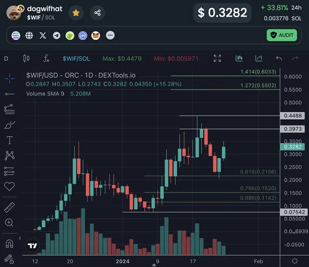 $WIF set an all-time high at $0.448 last week before falling into support at $0.215 (.618 Fib) yesterday.