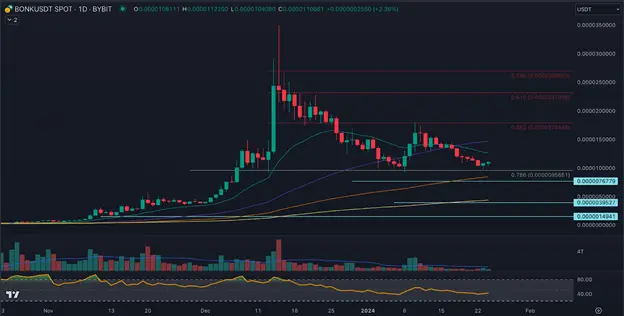 The cryptocurrency has been trading inside a range between support at $0.0001 and resistance at $0.000178 since late December 2023.