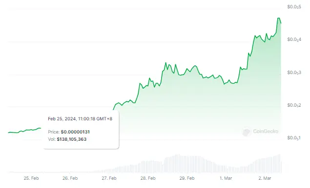 The weekly and daily chart patterns, when analyzed, show consistent growth that might perhaps reach new heights. February saw the start of Pepe’s value climb, which culminated in a 200% spike in just one week.