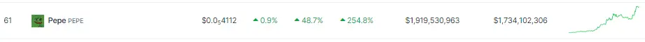 Pepe Coin has stood out in this surge of interest, coming in third place in the meme coin rankings, only behind Shiba Inu (SHIB) and Dogecoin (DOGE). This rise suggests that investors are becoming more interested.