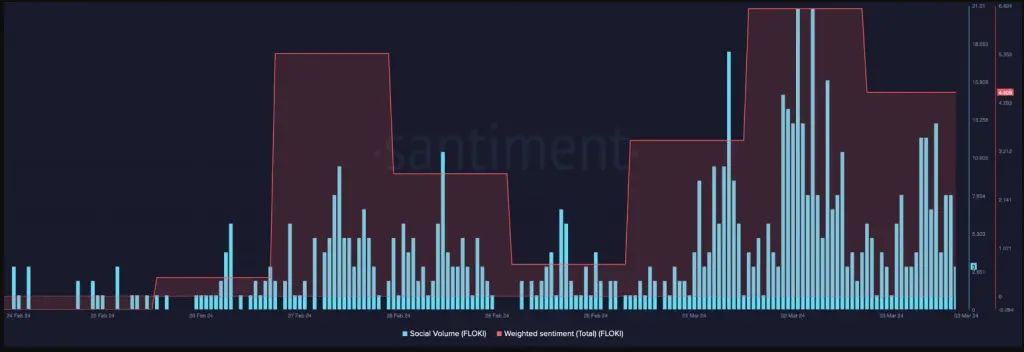 Moreover, a rise in weighted sentiment suggests that positive views towards the token prevail at the time of writing. This growing social media buzz and optimistic sentiment have played a role in attracting attention to Floki Inu and contributing to its meteoric rise in value.