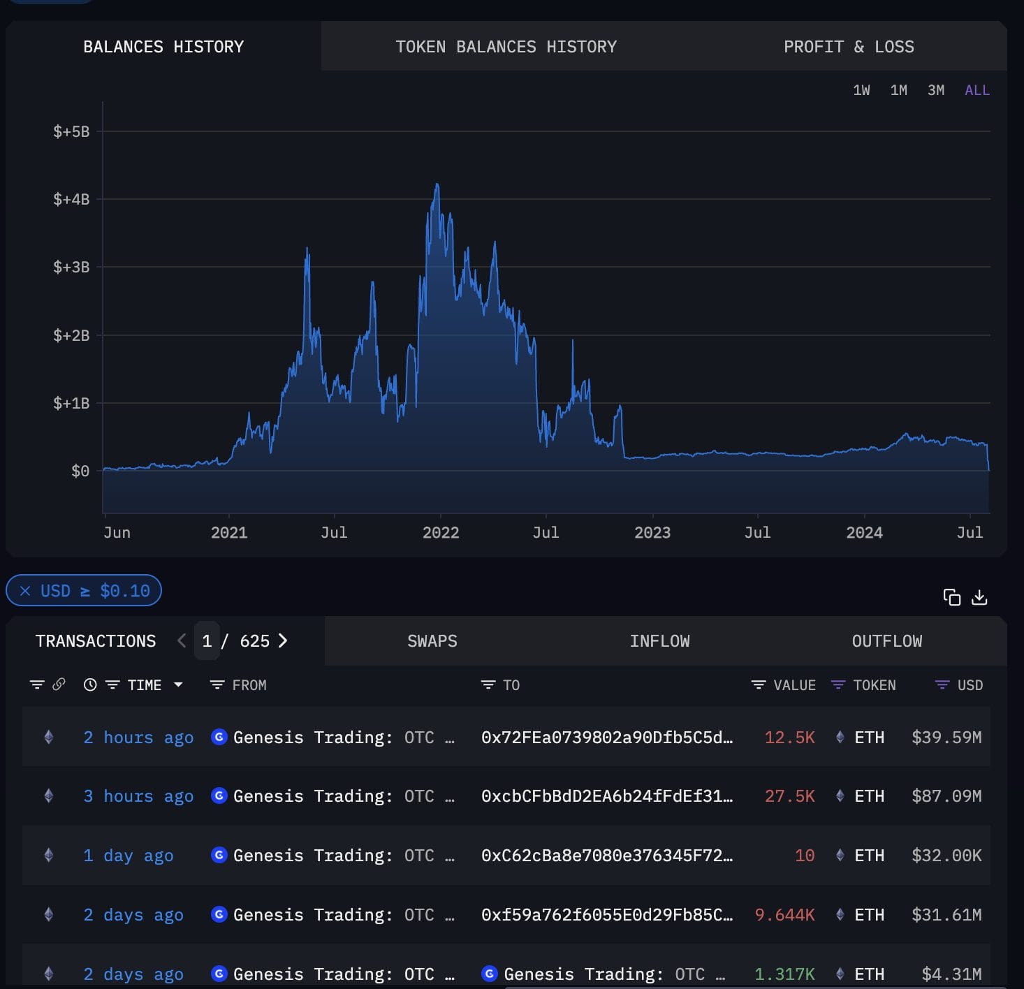 The Genesis Trading-labeled wallet has transferred more than 12,600 Bitcoin (BTC) worth around $719.9 million through June-July, mainly in transactions of 500 to 700 BTC.
