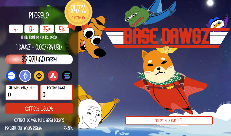 Base Dawgz (DAWGZ) is an innovative, doge-themed meme coin catching eyes in its ICO stages, raising over $2.9 million so far. This is largely due to its novel refer-to-earn (R2E) model combined with massive staking rewards.