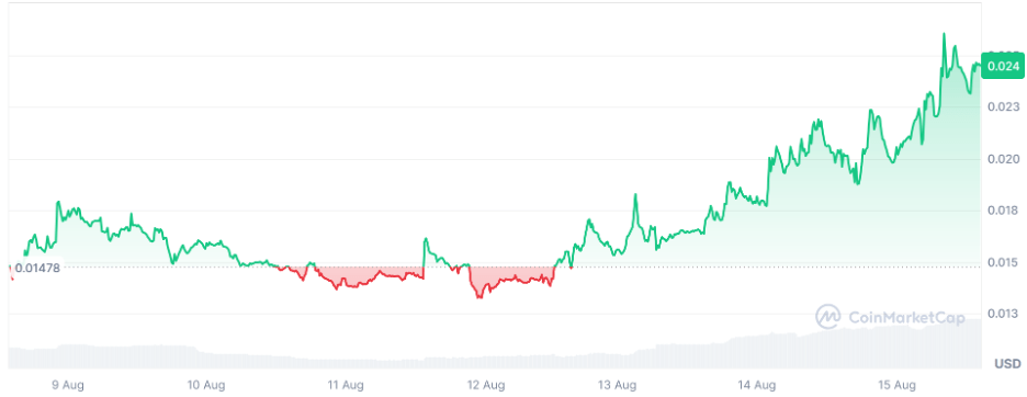 Gigachad (GIGA) is a cultural meme coin released in April on Solana. It quickly captured the hearts of its cult-like following, up 68.75% over the last week to $0.02455.