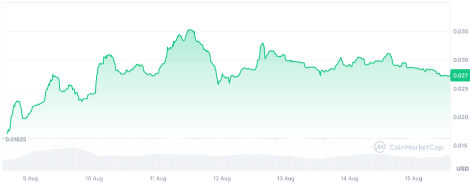 Basenji (BENJI) is another dog-themed meme coin, taking its image after one of the oldest dog breeds in the world, hailing from ancient Egypt. BENJI has grown 67.42% over the past week, trading at around $0.02727.
