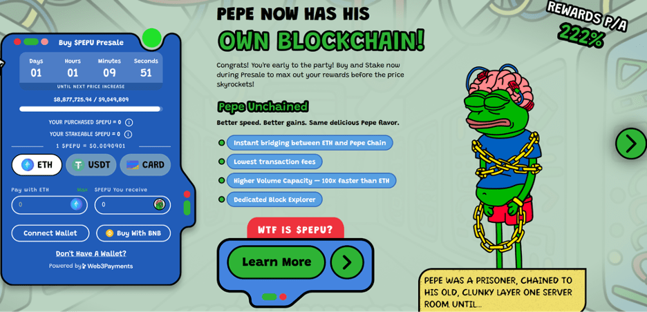 Pepe Unchained (PEPU) is a daring new project looking to resolve the biggest problems in the ETH meme coin space. With 100x faster speeds than ETH, a dedicated block explorer, and minimal gas fees, it’s not hard to see how PEPU raised over $8.8 million in its presale so far.