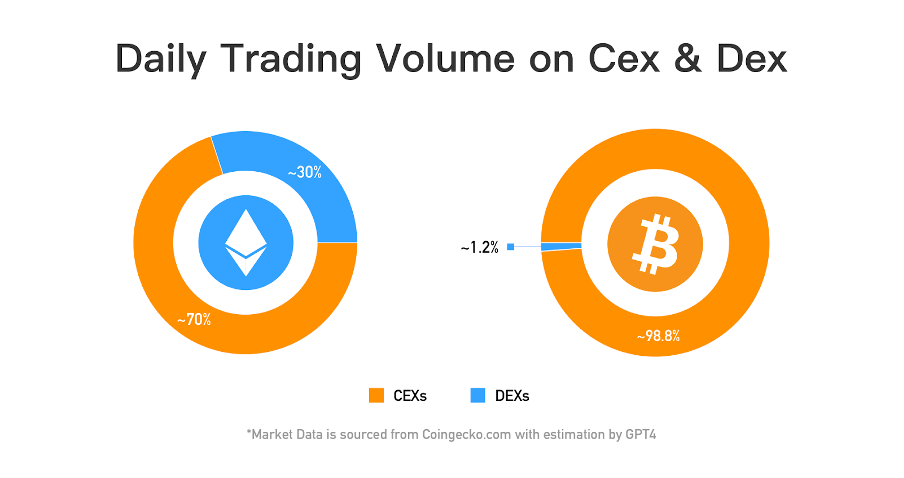 • Ethereum: CEX trading volume is around $20.85 billion (~70%), while DEX volume is $8.93 billion (~30%).
