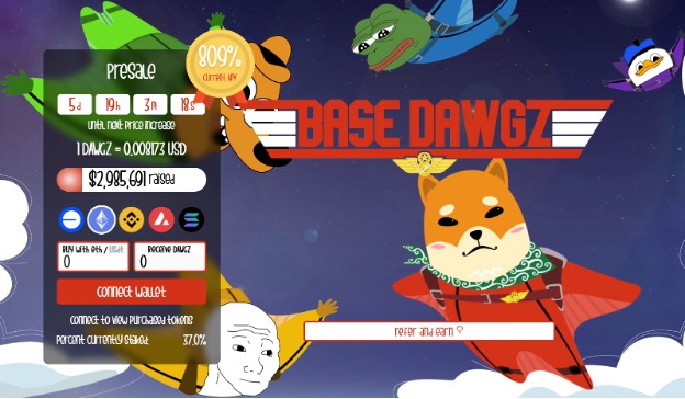 Base Dawgz (DAWGZ), a meme coin project on the Base chain, is about to pass its $3 million funding goal, with over $2.9 million already raised, and selling for $0.008173 each. The token employs an innovative refer-to-earn model, rewarding users for sharing content about DAWGZ on X (Twitter.)