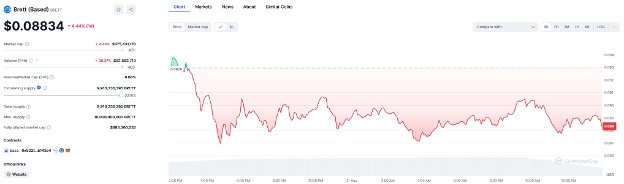 Amid the rise, Brett’s market cap nearly reached $1 billion, with 24-hour trading volume soaring by 126% to over $55 million.
