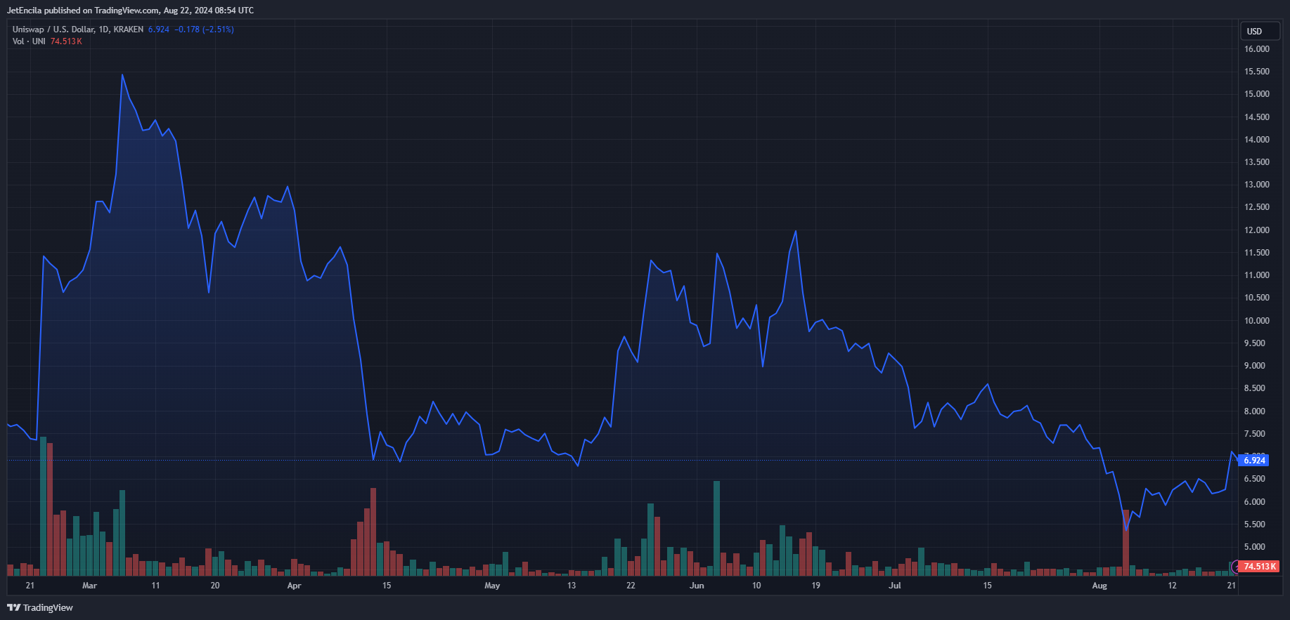With the broader market swing suggesting that most cryptocurrencies are in a bull run, Uniswap has continued its upward trajectory, capturing some of the momentum of the broader market. According to CoinGecko, the token is up nearly 12% since last week despite the market dipping slightly yesterday, August 21st