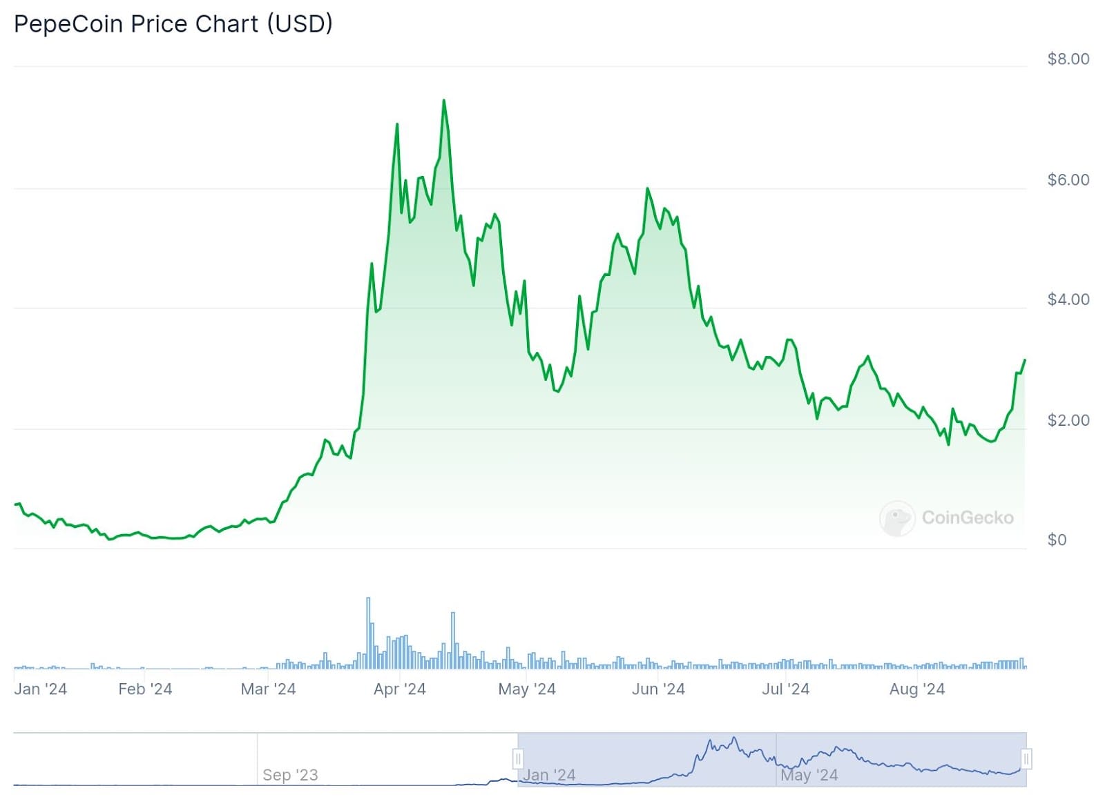 These gains mark one of the best few days the sector has seen since its peak in May. For instance, $PEPECOIN almost had an eight-day winning streak without the 1.46% dip on Saturday. Currently trading at $3.27, it’s now just eighty cents away from hitting $4, a level it hasn’t reached since June 12.