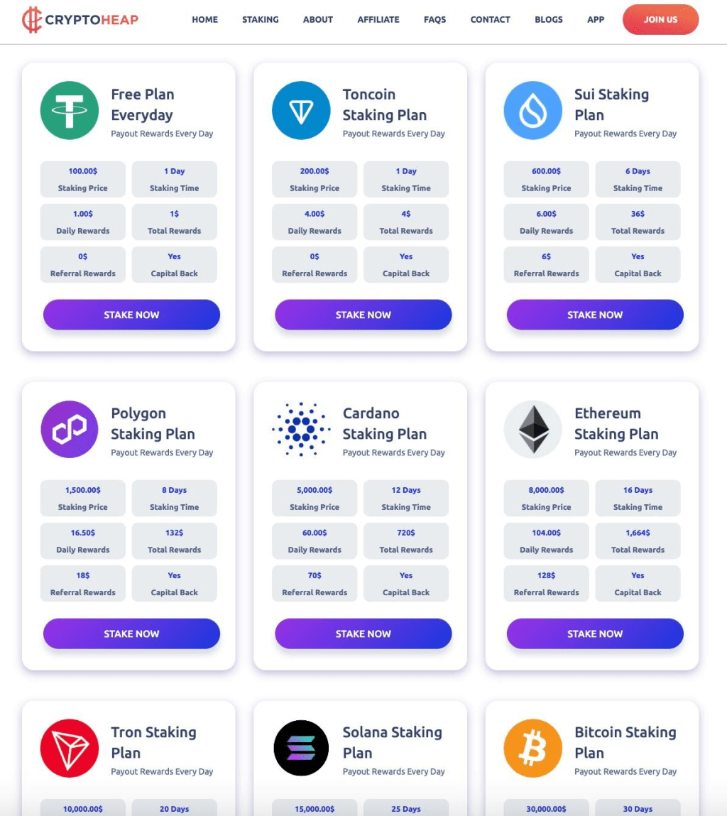 3. Competitive Staking Plans: There are competitive staking plans in CryptoHeap with high annual percentage yields. This allows the users to select a plan according to their investment goals and desired risk level.
