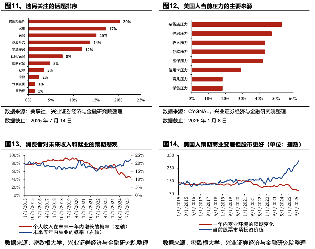 Nhiều dữ liệu thăm dò khác nhau cho thấy sự hài lòng của Trump trong năm đầu tiên của chính quyền là không cao. Nhìn lại năm 2025, nền kinh tế tiếp tục là một vấn đề thậm chí còn quan trọng hơn đối với cử tri. Nhưng việc áp dụng thuế quan và các chính sách chống nhập cư và sự khác biệt của nền kinh tế hình chữ K của Mỹ đã gây khó khăn cho việc duy trì hình ảnh của Trump về mặt kinh tế tốt. Vào năm 2025, tỷ lệ ủng hộ ròng của Trump sẽ giảm trong suốt cả năm. Theo tiểu bang, các bang đỏ đậm như Nebraska, Kansas, North Dakota và Arkansas cũng giảm tỷ lệ ủng hộ vào cuối năm. Về nhân khẩu học, tỷ lệ ủng hộ của Trump vẫn còn rất chênh lệch và tỷ lệ ủng hộ cử tri ở các giới tính khác nhau, trình độ học vấn khác nhau, chủng tộc khác nhau và các đảng phái chính trị khác nhau được phân biệt. Chỉ có đảng Cộng hòa và người da trắng có trình độ học vấn thấp mới có tỷ lệ ủng hộ ròng tích cực, trong khi phần còn lại của các nhóm đã chuyển sang tiêu cực về sự ủng hộ ròng đối với Trump.