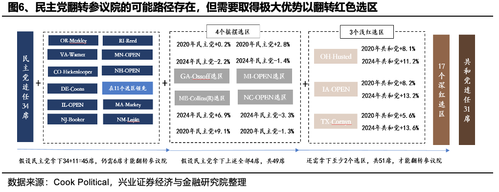 Trong số 35 quận tái đắc cử, chỉ có bốn khu vực bầu cử: Georgia (quận của Ossoff), Michigan (OPEN), Maine (quận của Collins) và Bắc Carolina (OPEN) có một cuộc bầu cử lưỡng đảng cân bằng. Điều này có nghĩa là nếu đảng Dân chủ muốn đảo ngược Thượng viện, họ sẽ không chỉ cần giành chiến thắng ở cả bốn khu vực dao động mà còn phải đảo ngược thêm hai khu vực do đảng Cộng hòa dẫn đầu. Cụ thể, ba khu vực bầu cử màu đỏ nhạt của OH-Husted, IA-OPEN và TX-Cornyn (sau này là thượng nghị sĩ đương nhiệm của quận, được đánh dấu là OPEN nếu thượng nghị sĩ đương nhiệm từ bỏ việc tái tranh cử) đều bỏ phiếu cho Trump (Đảng Cộng hòa) trong cuộc bầu cử tổng thống năm 2020 và 2024, và giành chiến thắng hai trong số ba khu vực bầu cử màu đỏ nhạt trong cuộc bầu cử giữa nhiệm kỳ năm 2026 đòi hỏi Đảng Dân chủ phải có được mức độ lãnh đạo và thiện cảm cao hơn trong dư luận Mỹ. Cuối cùng, ngoài ba khu vực bầu cử màu đỏ nhạt, 17 ghế Thượng viện màu đỏ thẫm còn lại tham gia cuộc bầu cử giữa nhiệm kỳ khó đạt được hơn các khu vực bầu cử màu đỏ nhạt trong bối cảnh phân cực chính trị hiện nay củng cố màu sắc chính trị của các khu vực bầu cử. Hiện tại, ngoại trừ bốn quận dao động, đảng Cộng hòa dẫn đầu là quận OH-Husted, lần lượt bỏ phiếu cho Trump 53,3% -45,2% và 55,1% -43,9% trong cả hai cuộc bầu cử năm 2020 và 2024.