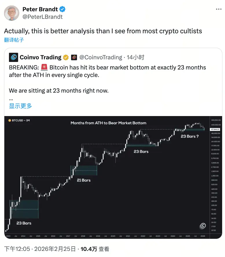 Peter Brandt, một nhà phân tích biểu đồ huyền thoại với hơn 50 năm kinh nghiệm giao dịch, trong lịch sử đã trở thành tâm điểm chú ý vì quan điểm của ông về cấu trúc thị trường của Bitcoin. Gần đây, quan điểm cho rằng “Bitcoin đã chạm đáy chính xác trong tháng thứ 23 sau khi đạt mức cao nhất mọi thời đại (ATH) mới trong mọi chu kỳ” đã làm dấy lên các cuộc thảo luận sôi nổi trên thị trường. Bài viết này sẽ xem xét các mô hình lịch sử dựa trên dữ liệu thị trường Gate (tính đến ngày 25 tháng 2 năm 2026) và phân tích vị trí hiện tại của Bitcoin kết hợp với tuyên bố mới nhất của Brandt.