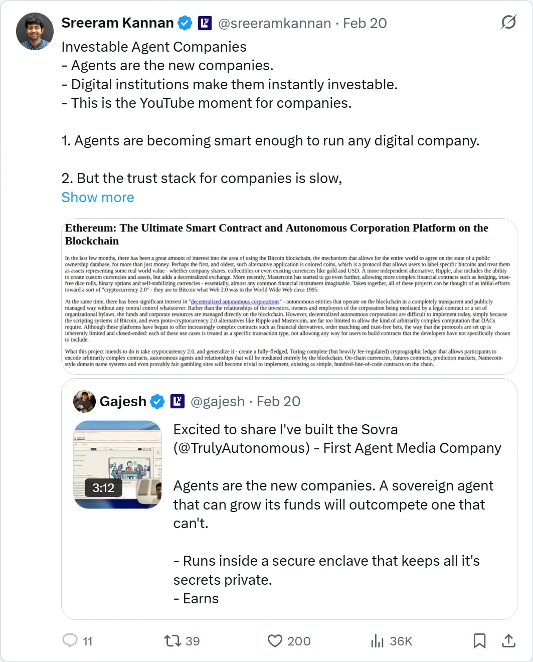 Đây là câu hỏi thú vị duy nhất tôi thấy hiện nay: làm thế nào để tận dụng siêu năng lực của tiền mã hóa — tạo vốn tức thì, toàn cầu, có thể lập trình — và hướng nó vào những thứ đang thực sự tăng trưởng? Chúng tôi tin rằng câu trả lời là các công ty Agent. Để làm được điều này, trước tiên cần cho phép token “sở hữu” tài sản, và chúng tôi đã xây dựng chức năng này trong năm năm qua. Giờ đây, chúng tôi sẽ biến nó thành sản phẩm để đạt mục tiêu đó.
