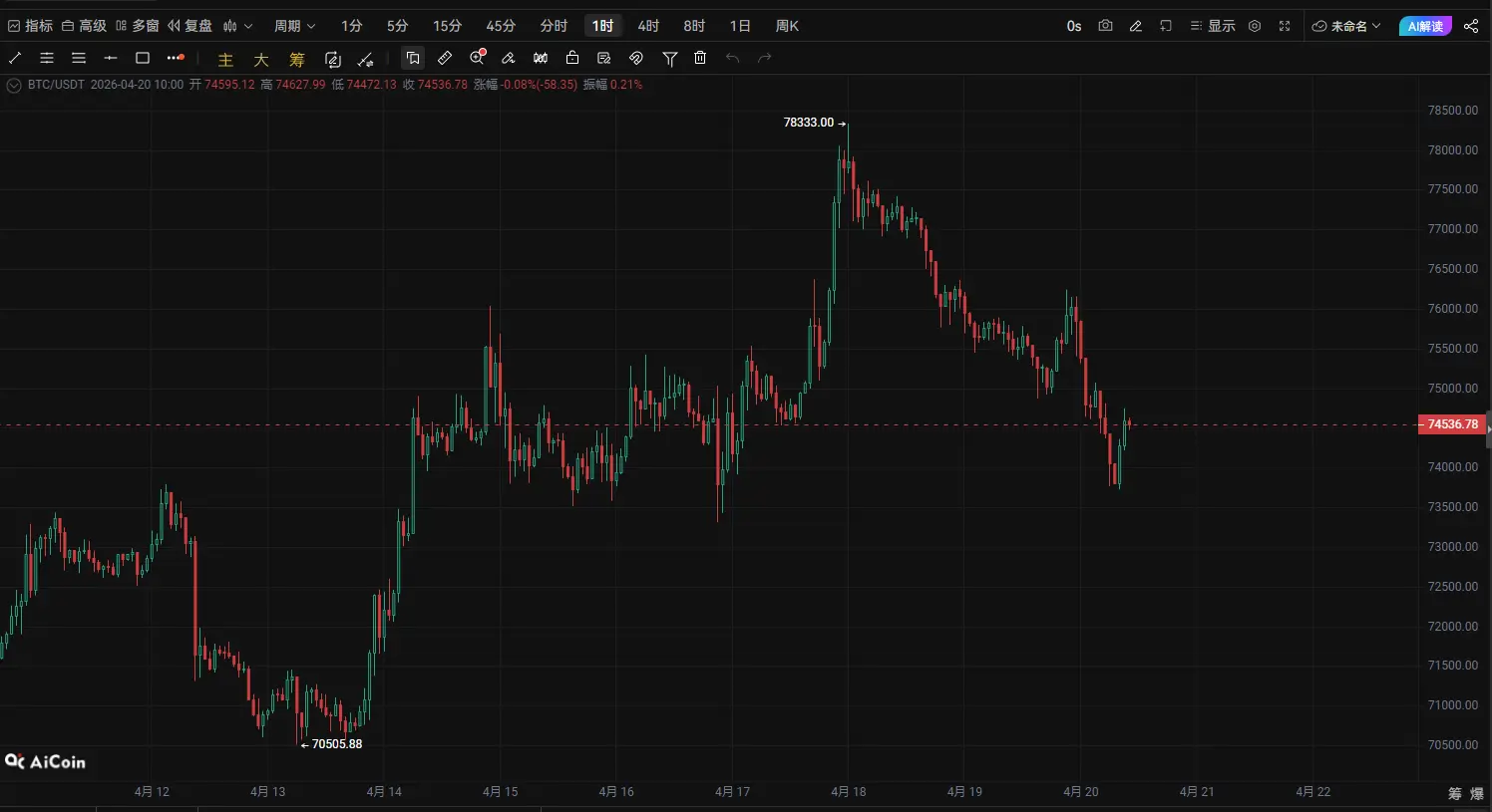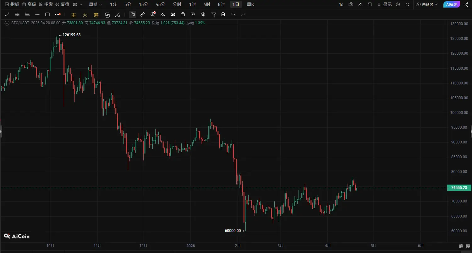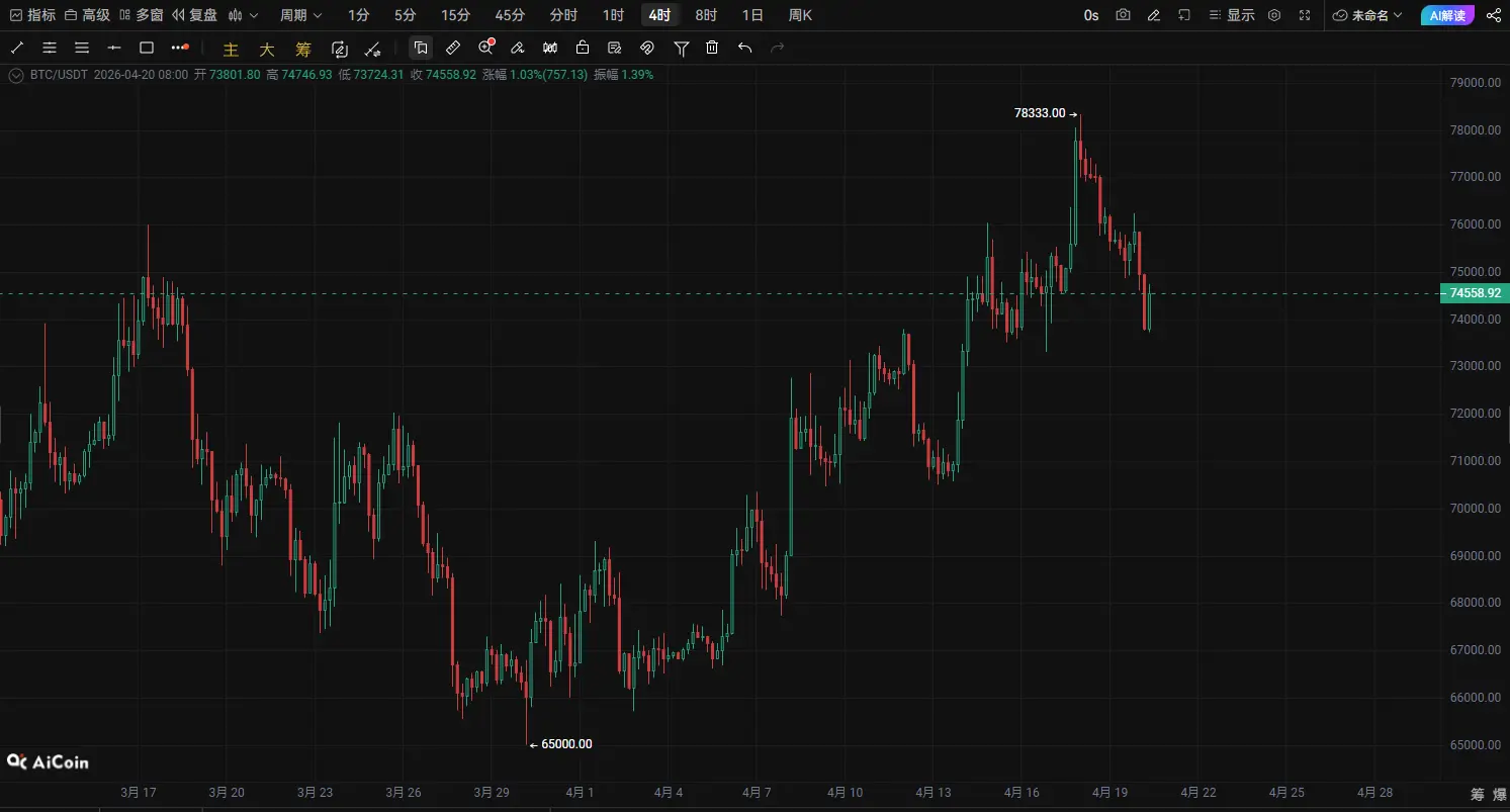 BTC tiến gần vùng biến động quan trọng! 74500 trở thành mốc sinh tử của phe mua và phe bán, đợt biến động tiếp theo có thể sắp bắt đầu|Phân tích kỹ thuật sâu ngày 20 tháng 4