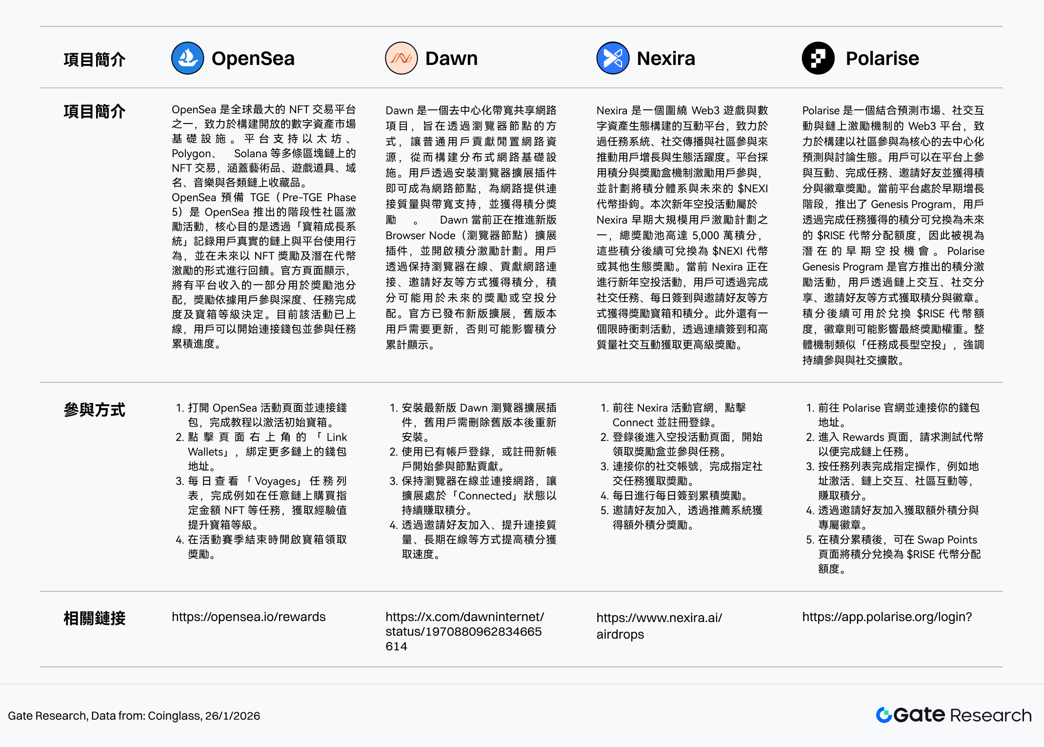 此外,本期重點追蹤 OpenSea、Dawn、Nexira、Polarise 皆處於活躍激勵階段,分別涵蓋 NFT 平台行為獎勵、去中心化頻寬節點、社交裂變積分體系與預測市場型社群生態,定位互補,參與路徑清晰。用戶可透過鏈上互動、社交綁定、邀請及簽到等方式持續累積積分、徽章或寶箱等級,提升未來潛在空投及代幣激勵權重。建議持續追蹤活動更新,強化早期與長期參與紀錄。