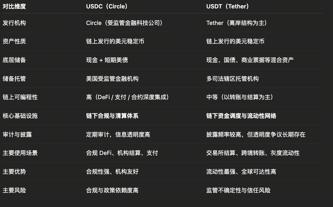 表面上,USDC、USDT 等穩定幣在區塊鏈上流通似乎「去中心化」,但本質上屬於由單一或少數機構發行的中心化產品。SEC 最新聲明指出,「受覆蓋穩定幣(Covered Stablecoins)係以美元等參考資產為掛鉤,並由低風險高流動性資產儲備支持的加密資產」。換言之,這類穩定幣承諾可隨時按 1:1 向發行機構或信託兌換美元,其價值完全依賴後端法幣資產。例如,Circle 表示 USDC「100% 由高流動性現金及現金等價物支持,始終可 1:1 兌換美元」,並由四大會計師事務所進行月度審計,確保儲備價值不低於流通量。但這些資產儲備並非存放於區塊鏈,而是存在銀行帳戶與貨幣市場基金。Circle 披露,大部分 USDC 儲備配置於美國國債及政府貨幣市場工具,並由 BlackRock 管理的 2a-7 政府貨幣市場基金承載;其餘部分則存放於紐約梅隆銀行、花旗、富國等大型銀行。這代表 USDC 的價值來自傳統金融體系中的銀行與資金市場,而非網路共識本身。
