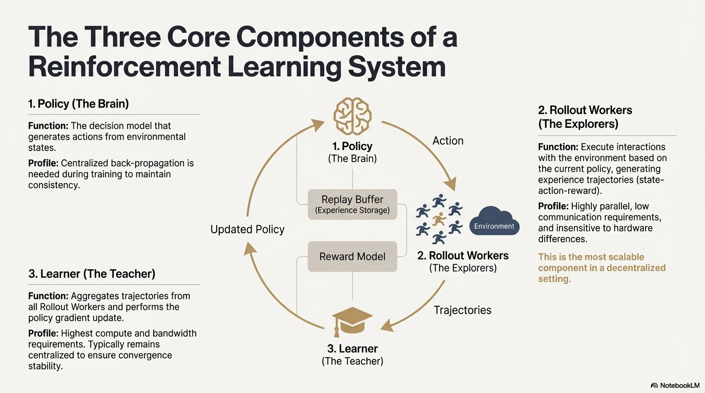 3. 學習器(Learner):聚合全部 Rollout 軌跡並執行策略梯度更新,是唯一對算力、頻寬要求最高的模組,因此通常保持中心化或輕中心化部署以確保收斂穩定性。