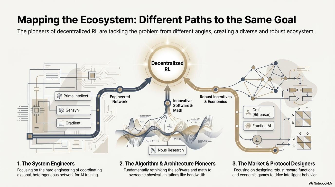 通訊稀疏、可平行的 Rollout 外包給全球消費級 GPU,高頻寬的參數更新集中於少量訓練節點,從 Prime Intellect 的非同步 Actor–Learner 到 Gradient Echo 的雙群架構皆如此。