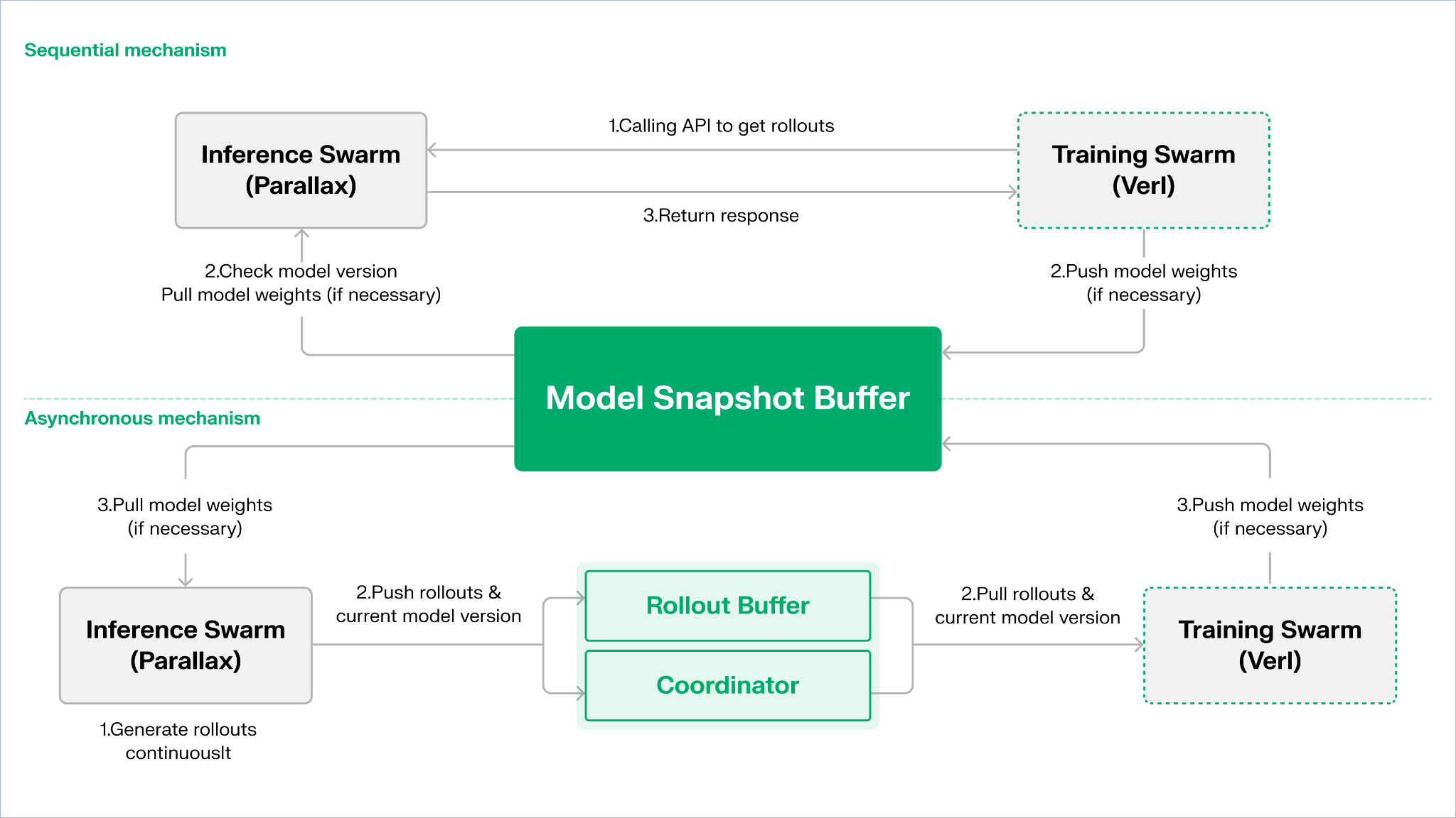 物理分離: 邊緣設備 (Inference Swarm) 只做推理/取樣,中心節點 (Training Swarm) 做更新