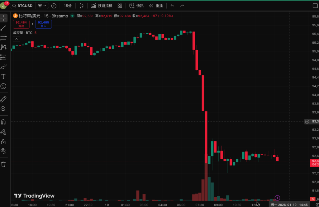 在華爾街多數交易員休假、流動性稀薄的週末夜,比特幣 (Bitcoin) 再度上演高速滑落。美東時間 18 日晚間,受川普總統關於「若丹麥不售格陵蘭將對八個北約盟國課徵 10% 關稅」的訊息影響,該加密資產四小時內自 95,500 美元急墜至 92,474 美元,並引爆超過 7.5 億美元多頭合約清算。市場在地緣政治與監管雙重陰影下,重新衡量風險資產部位。