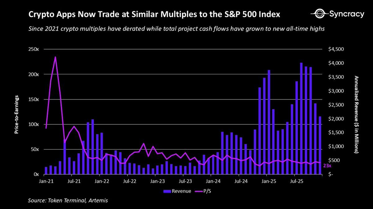 同時,市場對於一個簡單且經過時間考驗的原則達成了日益增長的共識:除了比特幣(BTC)和以太坊(ETH)這類罕見的價值存儲資產外,99.9% 的資產都需要產生現金流(Cash flows)。隨著更多基本面投資者進入該資產類別,這些框架只會被進一步強化,理性程度也隨之增加。