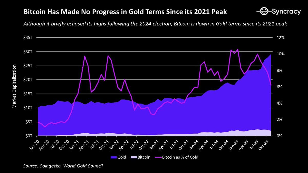 儘管我們取得了長足進步,但比特幣兌黃金的價格自 2021 年以來從未創下新高,實際上仍處於下跌狀態。誰能想到,在川普口中的全球加密首都,在歷史上最成功的 ETF 上市之後,在美元被系統性貶值的同時,比特幣作為數字黃金的成功程度竟然還不如四年前?