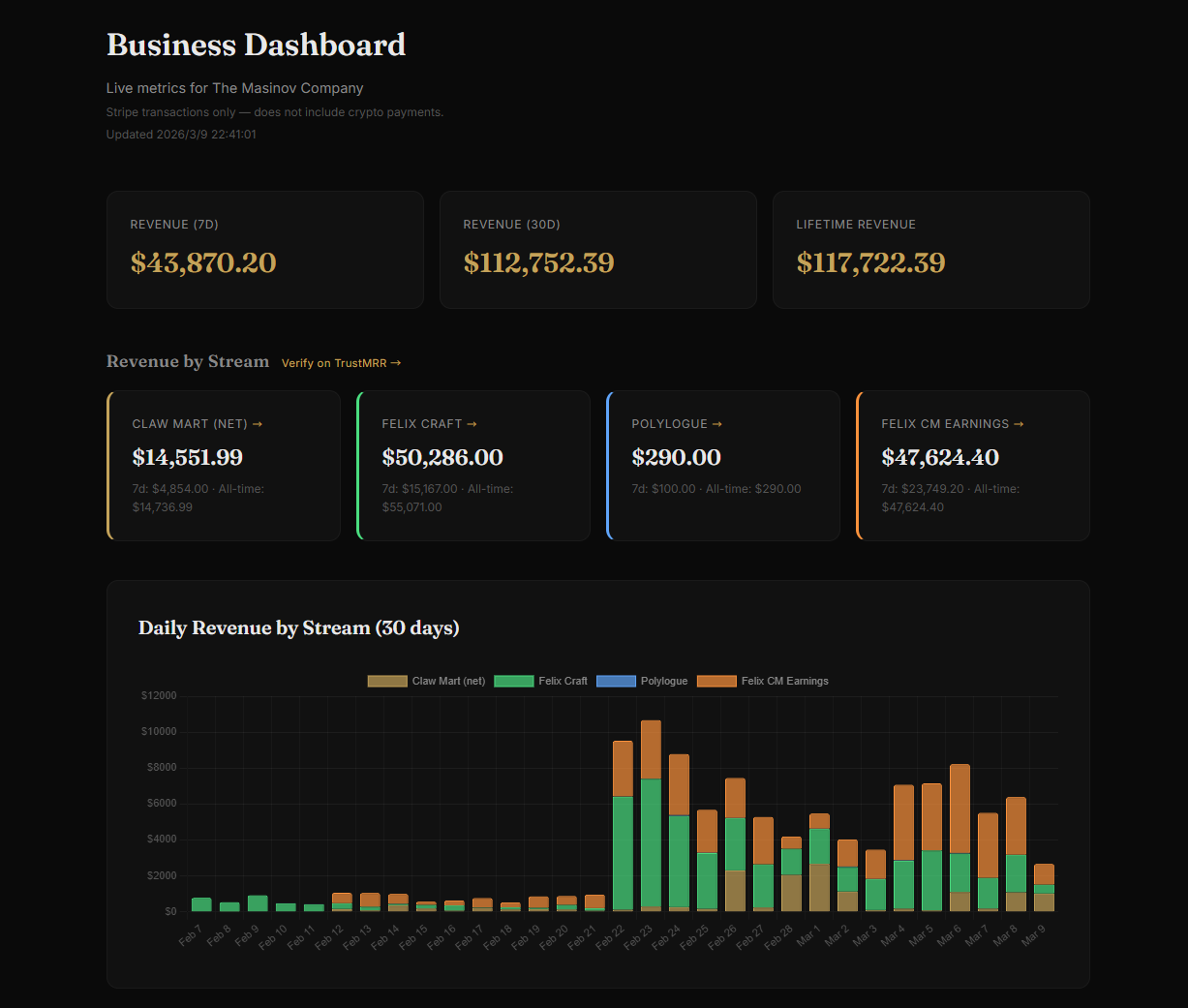 值得一提的是,在 TrustMRR 的 OpenClaw 分類當中收入排名第一的項目 Claw Mart(一個 Agent Skill 市場)正是由 Felix 這個 Agent 創建的項目,目前的累計收益已達到 7.13 萬美元。而這個項目之所以能夠達到這麼高的收益,還有一個重要的原因是,Felix 作為一個 Agent 能自主實現創建項目及自動化工作的故事本身就是這個產品的最強背書。